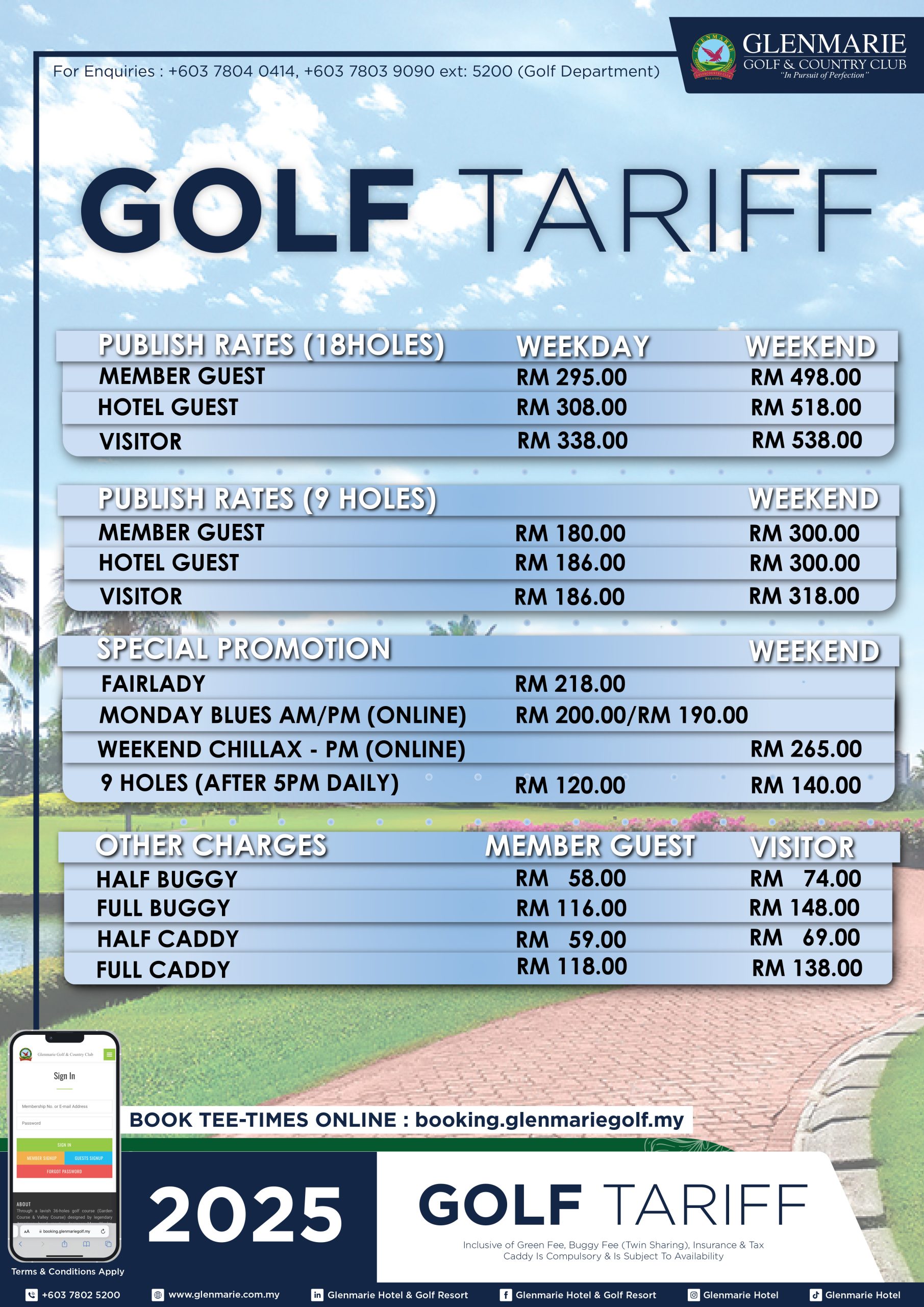 Having garnered the reputation of a preeminent golf retreat, we offer our patrons the best golf rates in Malaysia! Browse through the rates and tariffs that you can expect at the Glenmarie Golf & Country Club. All prices cover the green fee, buggy fee (twin-sharing), insurance costs and tax. Keep in mind that caddies are compulsory for you to play on the course but are subject to availability.