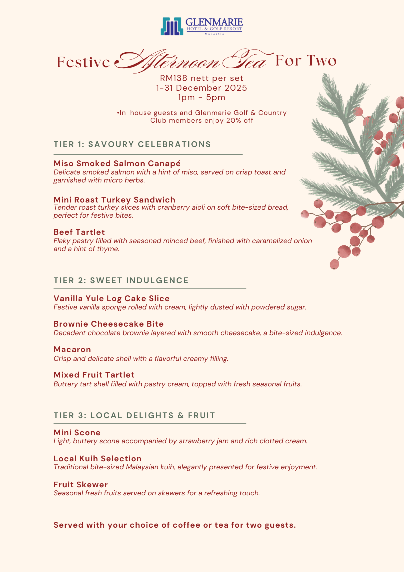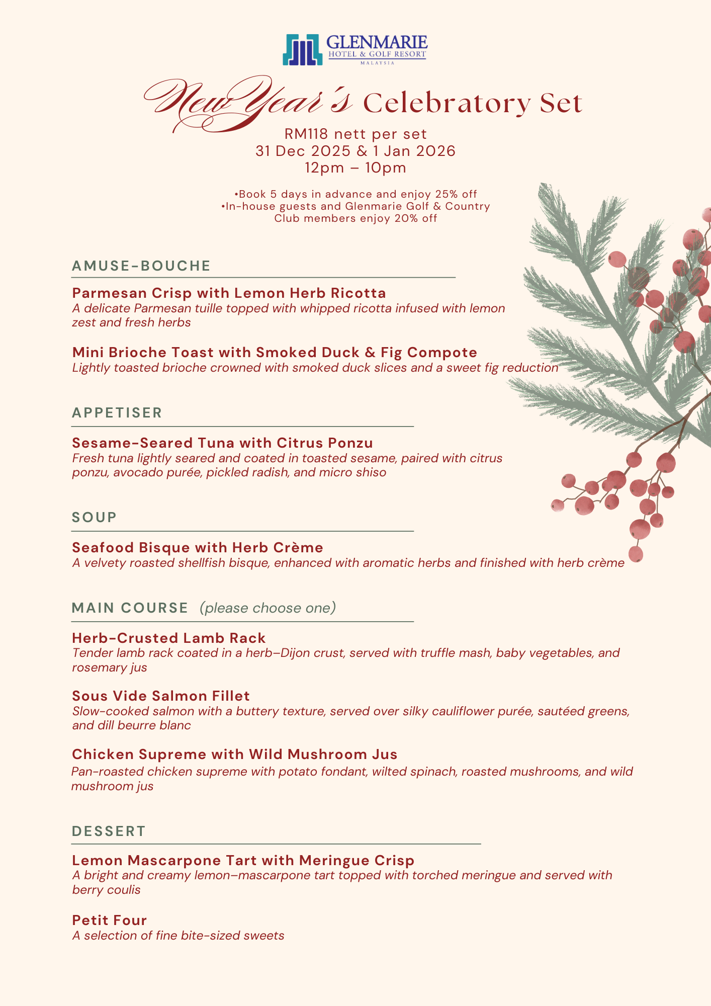 Celebrate Christmas and New Year at Glenmarie Hotel & Golf Resort with festive dining experiences crafted to delight every guest. From joyful gatherings to intimate year-end meals, our chefs present a seasonal lineup filled with warm flavours, elegant presentations, and the spirit of the holidays.