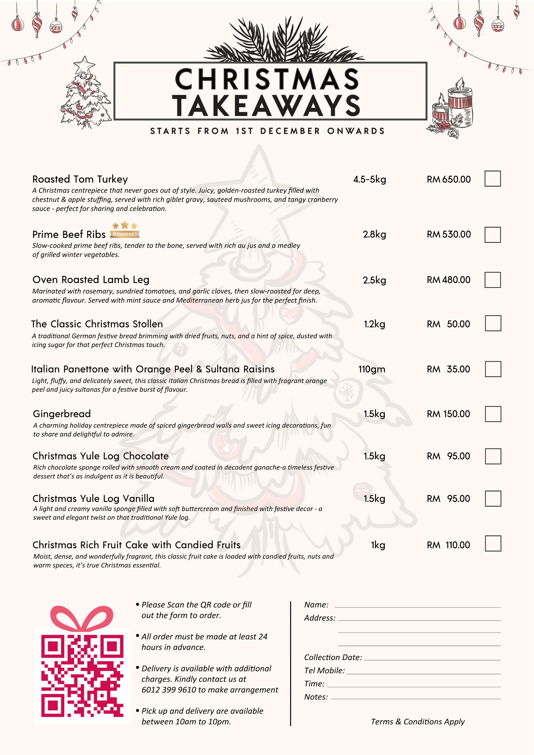 Make hosting effortless with our Christmas Takeaway Collection, featuring roasted turkey, prime beef ribs, lamb leg, and classic Christmas desserts — all expertly prepared for a luxurious celebration at home. Available from 1 December 2025. Click HERE to place your order today!